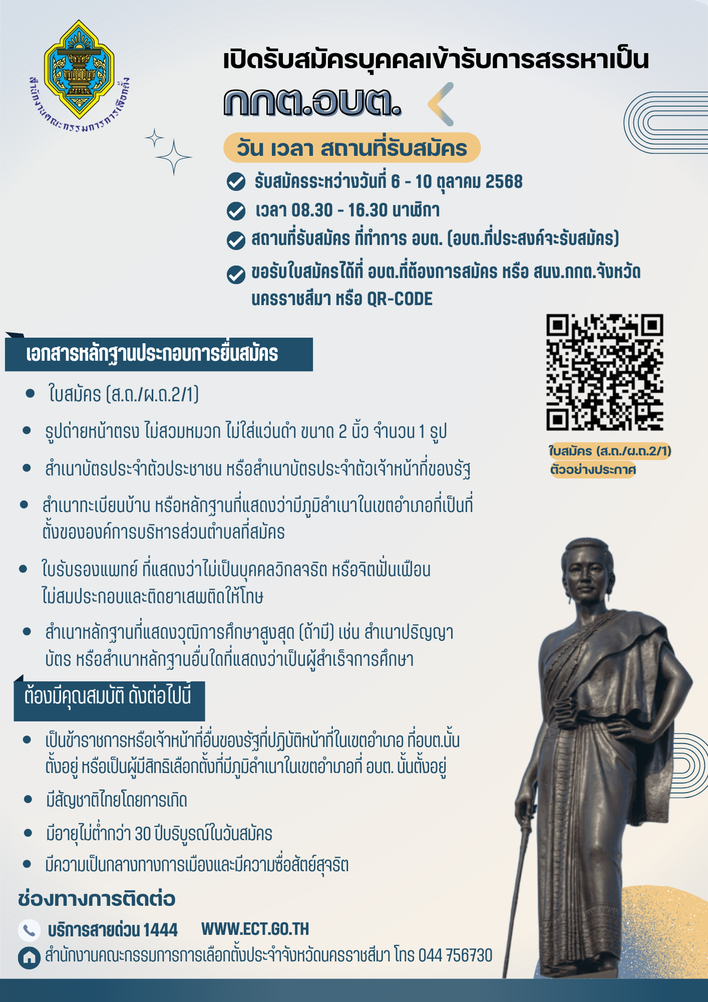 01 ต.ค. 68ประกาศผู้อำนวยการการเลือกตั้งประจำองค์การบริหารส่วนตำบลสำโรง เรื่อง การรับสมัครบุคคลเข้ารับการสรรหาเป็นคณะกรรมการการเลือกตั้งประจำองค์การบริหารส่วนตำบลสำโรง อำเภอโนนไทย จังหวัดนครราชสีมา